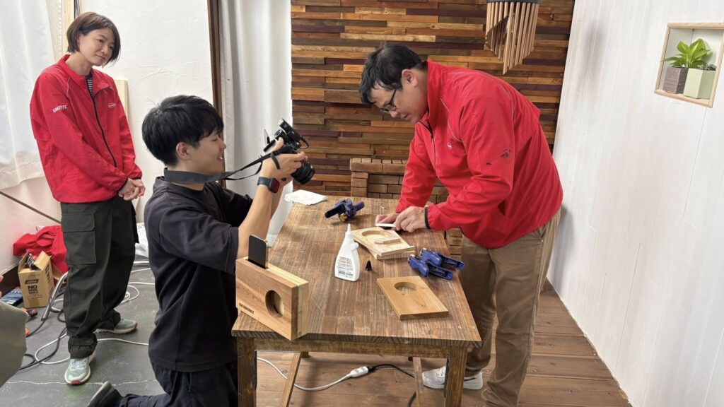 ヘンケルさんの動画撮影で京都に来ています。今回も2泊3日で4本撮り、撮影現場はおしゃべりと笑い声で終日賑やかです。とにかく楽しい現場です。クリスマスリースと壁埋め込み棚、ブロックでベンチ、ウッドスピーカー作り、無事終了です。お疲れ様!