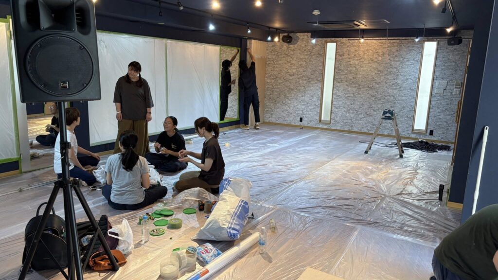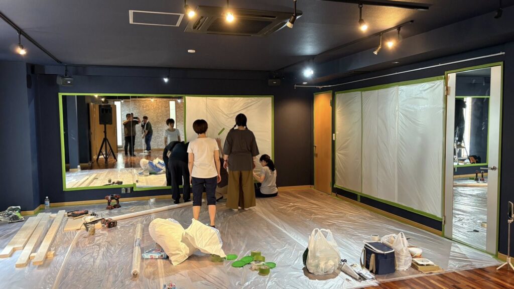 友人からの依頼で、都内にあるダンススタジオをDIYで改装中。初日は塗装前の養生、養生いのち! 友人の女子仲間が作業に多数参加しています。作業の合間にモグモグタイムも大事です。ここもクーラーが効いてるので嬉しい! お疲れ様。