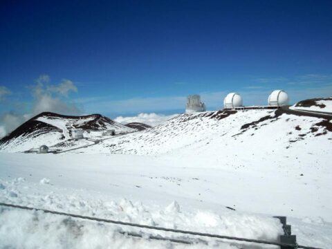 今日のマウナケア山頂は一面雪、中央がスバル展望台で…