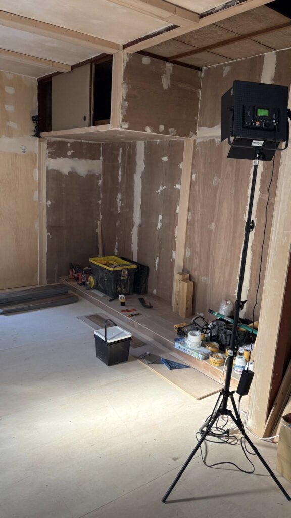 古家リフォーム撮影中、室内の塗装仕上げに →