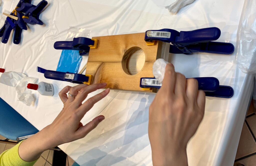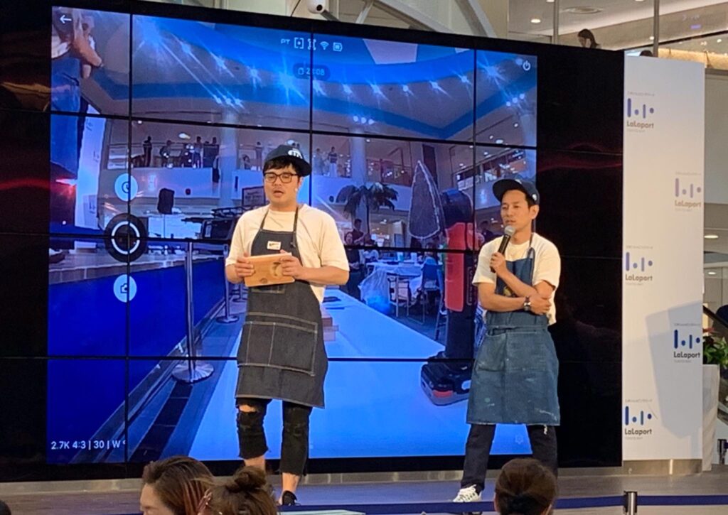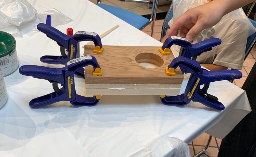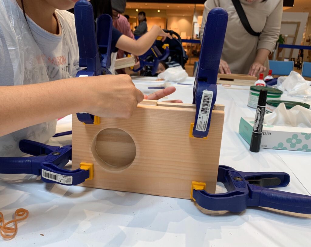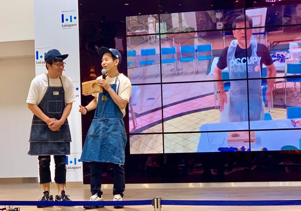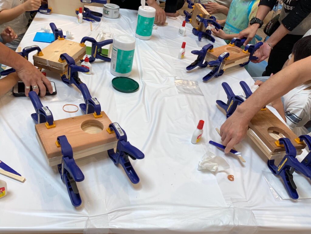 ららぽーとtokyo bayで佐田工務店DIYワークショップ開催、大盛況です。IRWINクランプ大活躍、120個用意したクランプがウッドスピーカーを圧着させる大事な仕事をしています。佐田工務店メンバーも今回は凄い! 棟梁佐田さんを筆頭にタケトさん、オヤカタくん、武井 俊祐さんの豪華メンバーに、佐田工務店レギュラーメンバーも含めて総勢9名です。ウッドスピーカー100個満員御礼、皆さんお疲れ様でした!