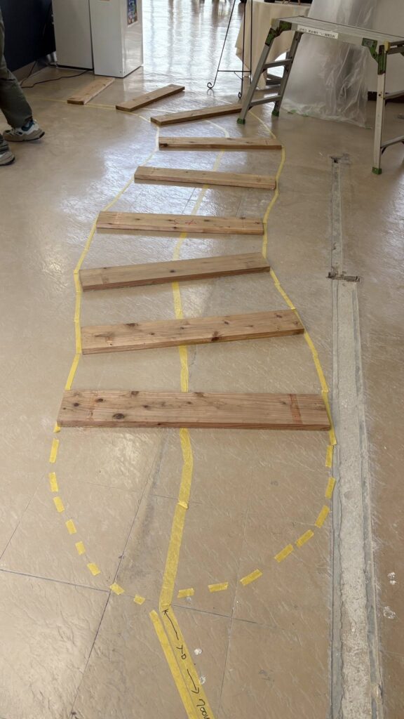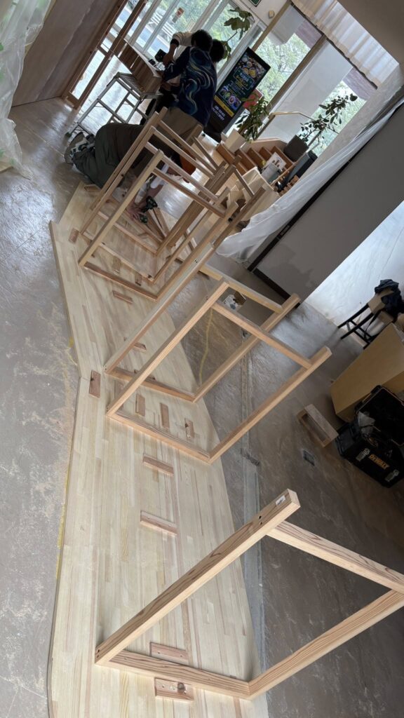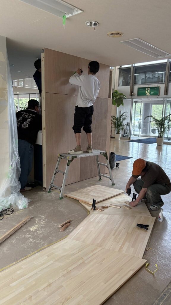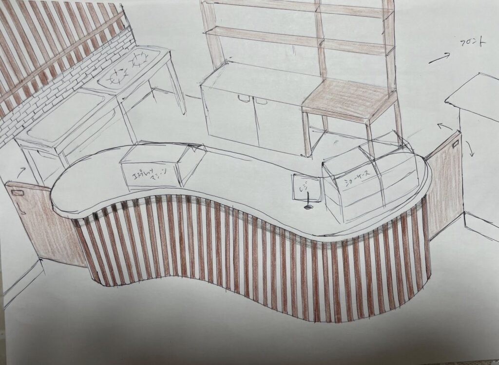 日曜日から3日間のスケジュールで鹿児島県の吹上砂丘荘に来ています。元は国民宿舎で、現在は新しくリフォーム中で営業再開されています。今回は友人の依頼で、ロビーにcafeを作ります。内装、家具を全てDIYで挑戦しています。私はイラストのようなカウンターで全長5.5mを担当。近くのホームセンターで材料を調達して、2日目でほぼ形が見えて来ました。集成材をビスケットジョインターでつないで、大きな天板を作っています。友人とその仲間は、仕切り壁やアーチデザインの壁など着々と進んでいます。明日の目標は完成!です。 続く。。。