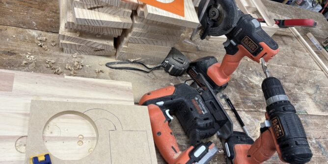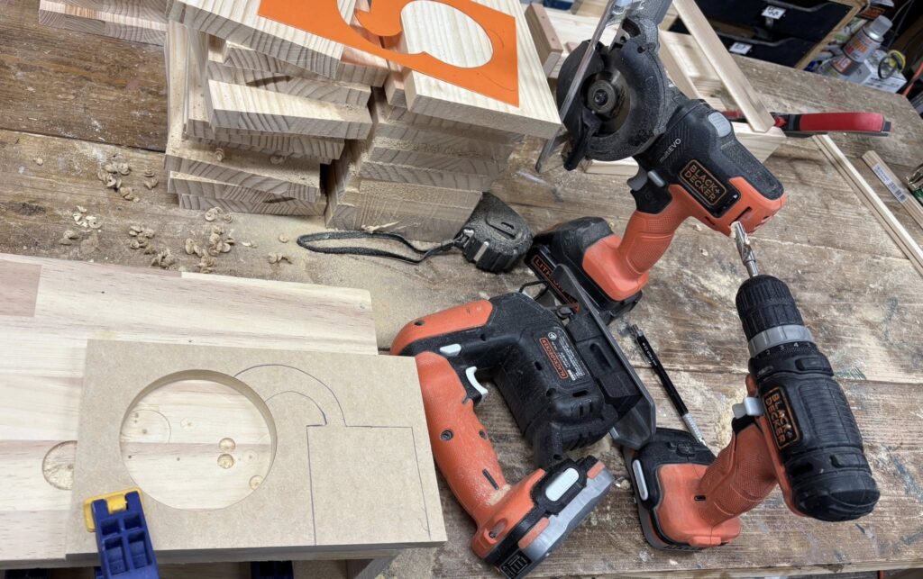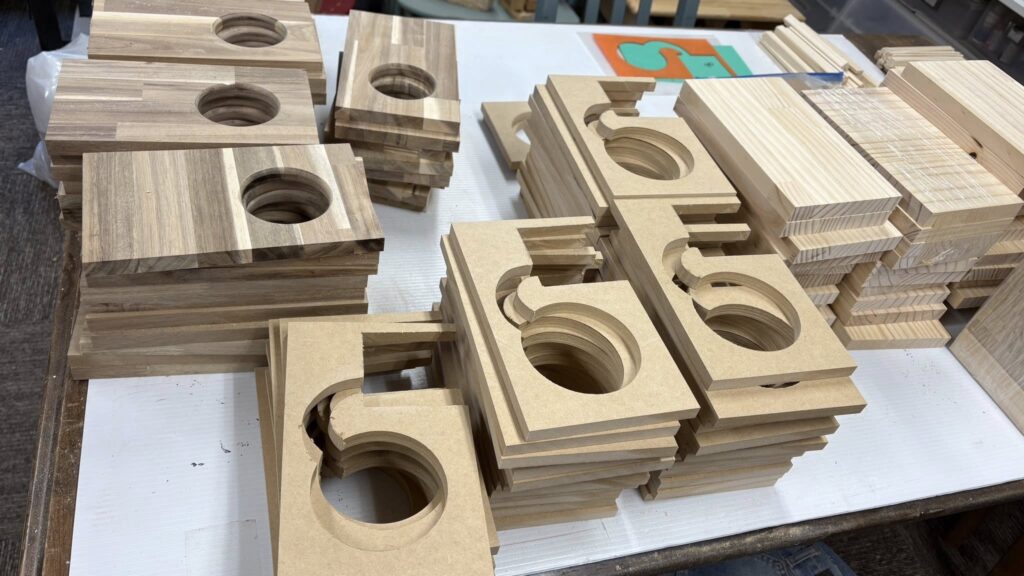 ウッドスピーカーを大量に加工中、ワークショップの準備です。