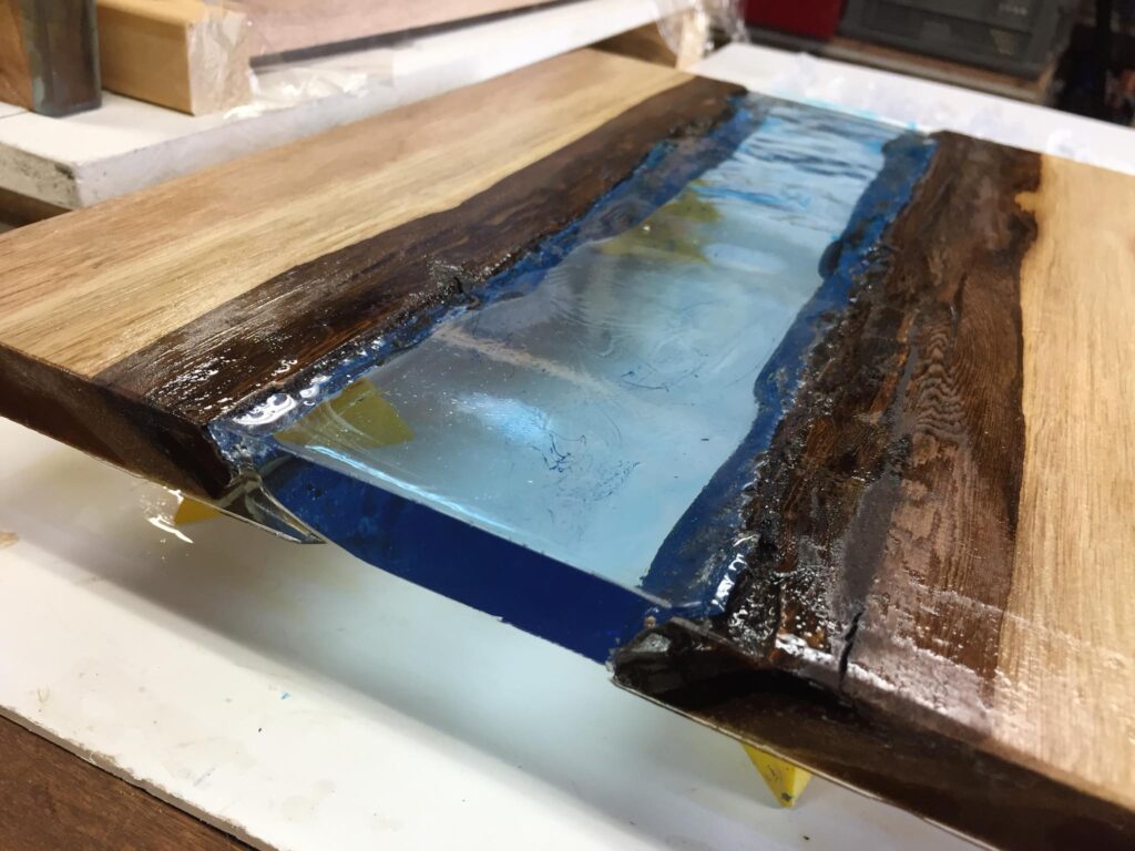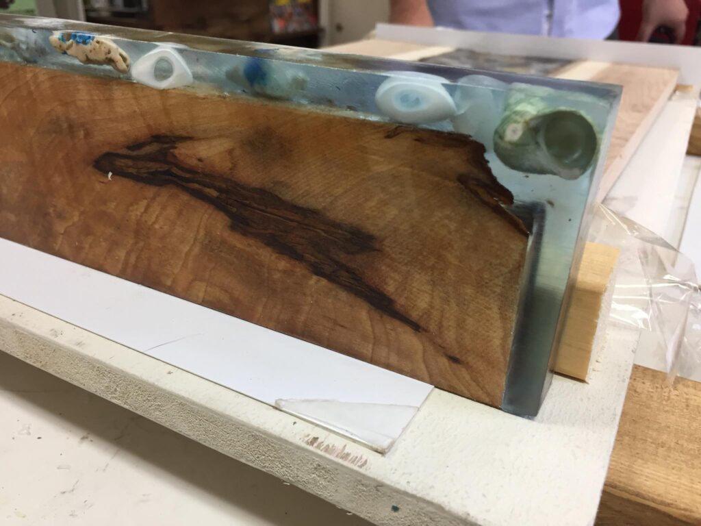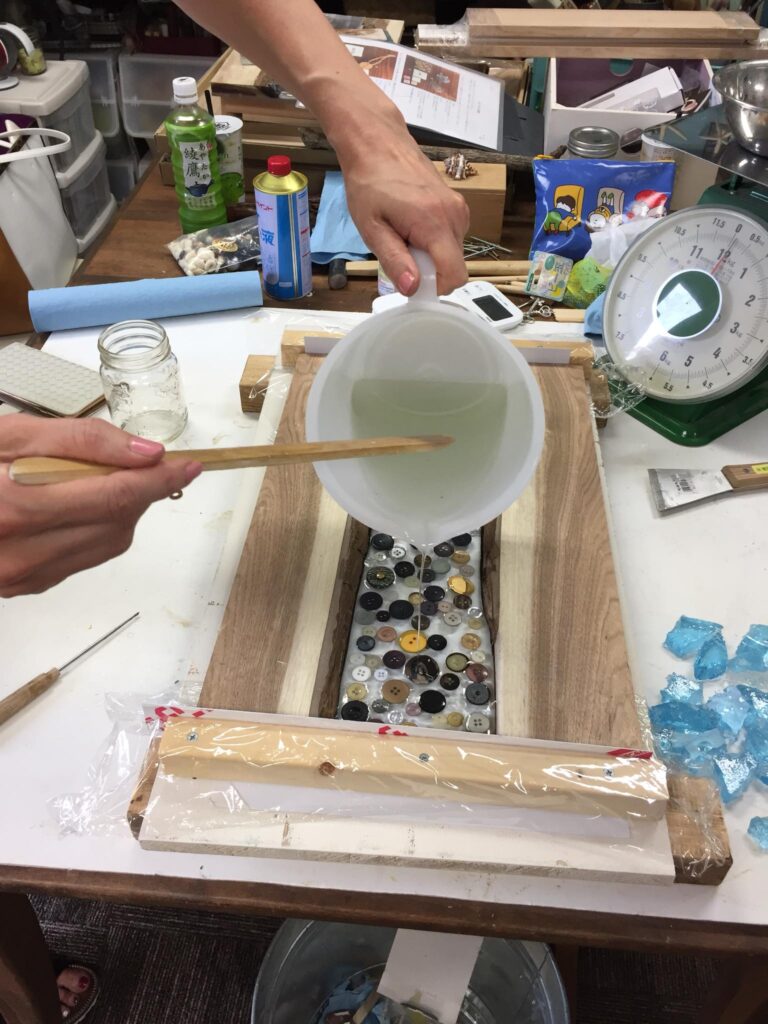 DIY研究会、今日は枠を外して仕上げ作業です。樹脂の透明感と木材の組み合わせがイイですね。ブルーの着色も素敵です。今回更にボタンを埋め込んだデザインにも挑戦中。7/1のDIYセミナーで作り方をご紹介します。