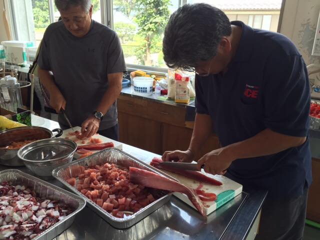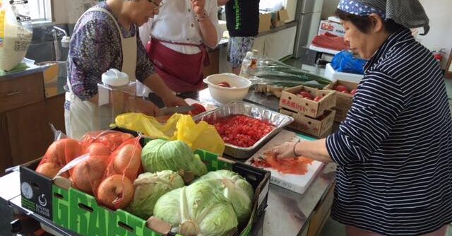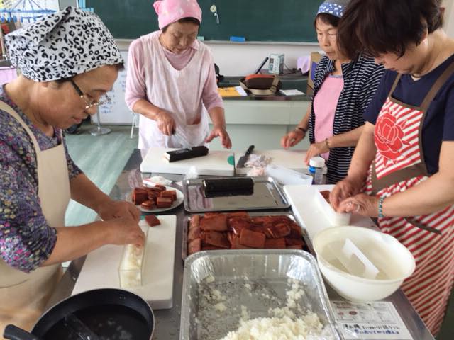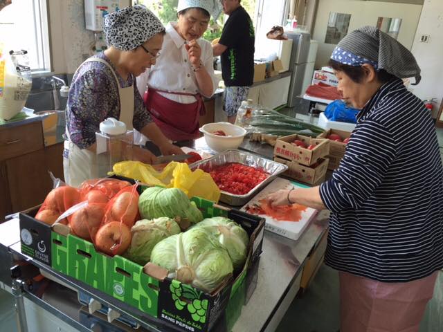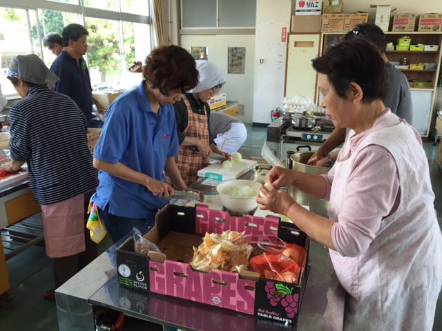 パーティの準備開始、顔なじみになった仮設のお母さんとアウンの呼吸で作業分担もスムーズです。全員一丸となって午前の作業は終了です。