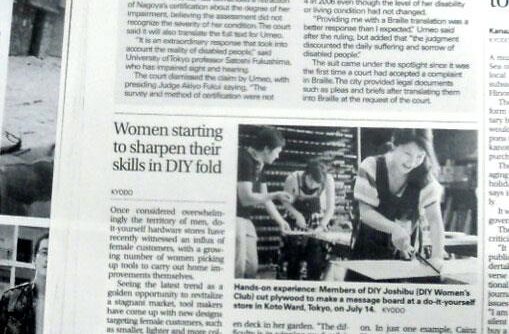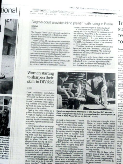 Posted in メディア活動 DIY女子部の活動がThe Japan Timesに Author: yamada yoshiteru Published Date: 20/09/2012 DIY女子部の活動がThe Japan Timesにも掲載されていました。ハワイの友人が持ってきてくれました。 Author: yamada yoshiteru